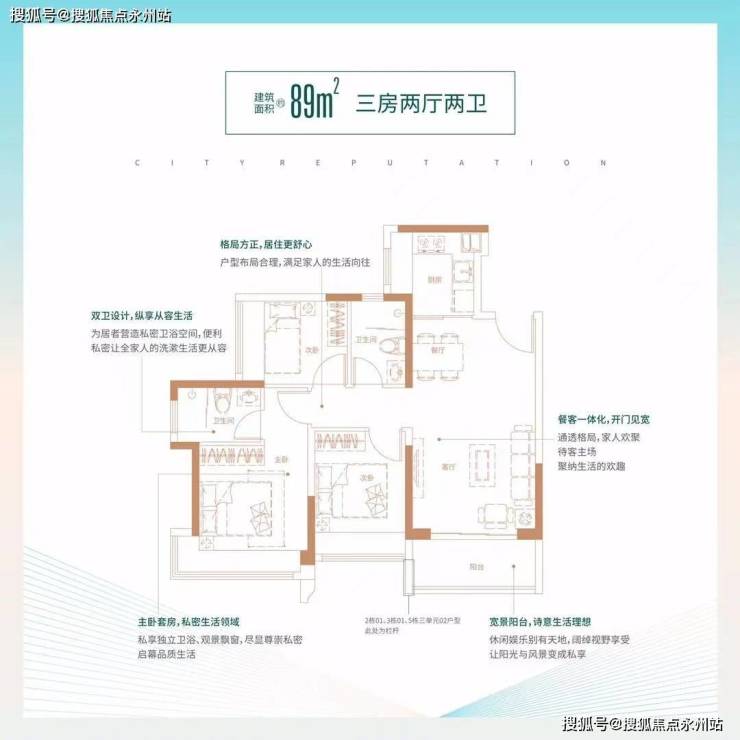 89㎡的3房2厅2卫:有2个户型,1个设计的经典竖厅格局,有西南及东南朝向;1个设计的竖厅南北通透格局,U型厨房。