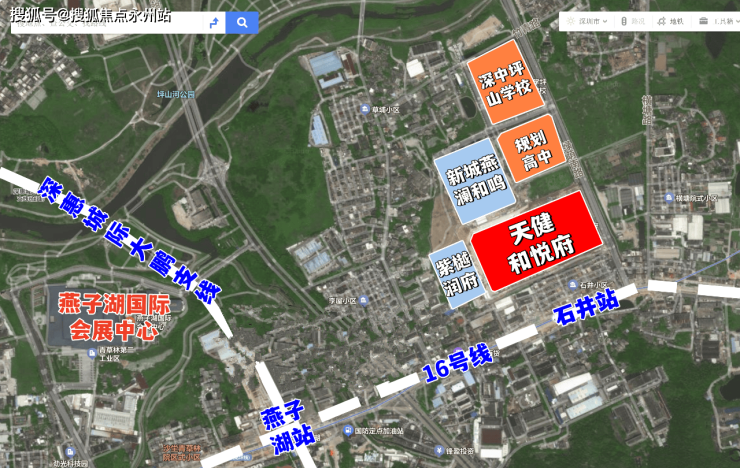 天健和悦府:位于坪山区石井街道金田路与绿荫南路交汇处西北侧,项目地处燕子湖片区,西北部为燕子岭公园,坪山河自西向东贯穿而过,区内汇聚了山、水、田、林、湖、草等多要素,得天独厚“看山、见田、拥河、揽湖”的生态优势是深圳市独一无二的生态资源,片区西侧的深圳坪山燕子湖国际会展中心,与深圳国际会展中心,深圳会展中心也是形成了一城三馆的格局。