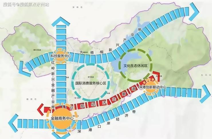 大湾区金融极:其中红岭新兴金融产业带作为"深圳三大金融增长极”之一,与前海国际金融城、福田香蜜湖金融街并列,罗湖将先天的金融优势及政府的政策支持,以金融产业赋能罗湖新发展,助力深圳成为大湾区经济发展引擎。( 信息来源:罗湖发布)