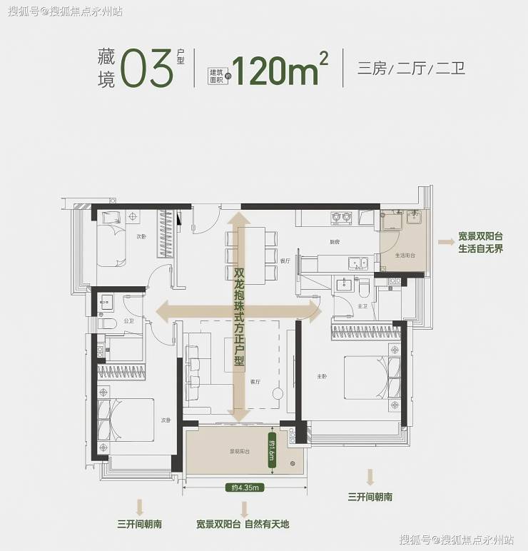 03户型 约120㎡3房2卫:双龙抱珠户型,三开间朝南,双阳台设计,该户型为正南朝向,户型方正,双阳台,三开间朝南,能实现三面宽采光“双龙抱珠”设计的居住格局,中庭为厅,主客卧分布于客厅两侧,在提高空间利用率的同时,也能显著提高居住的私密性,主卧套房设计,带观景浴室,双阳台设计,主阳台进深约1.5米观景阳台,拥有270°向外视野景观,俯瞰安托山,生活阳台连接双面操作厨房,还能看塘朗山景观。