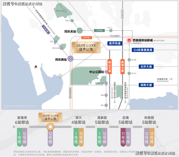 项目位于12号线同乐南站(约600m),1站中山公园/4站科技园/5站高新园,15号线同乐关站(在建中,预计2028年12月开通),串联宝中/前海/深圳湾/西丽,也被称为深圳“一环线”,本项目为环线上的重要一环,24号线(规划中)开通后4站高新园。