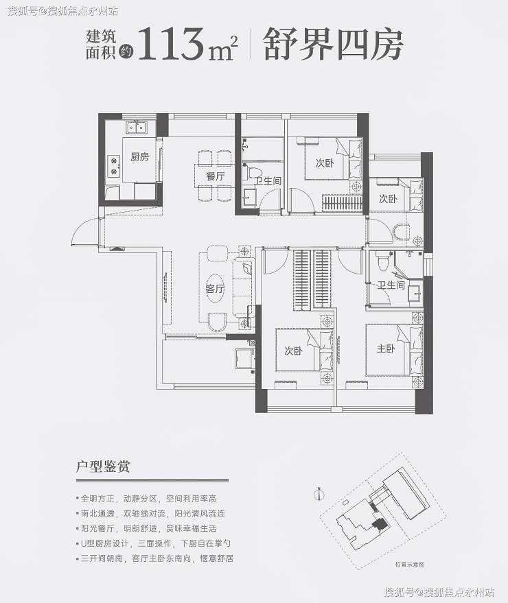 104㎡三房两卫:竖厅南北通透,U型厨房(操作台面4.5米),主卧带270°飘窗,东南朝向阳台,得房率75.19%。