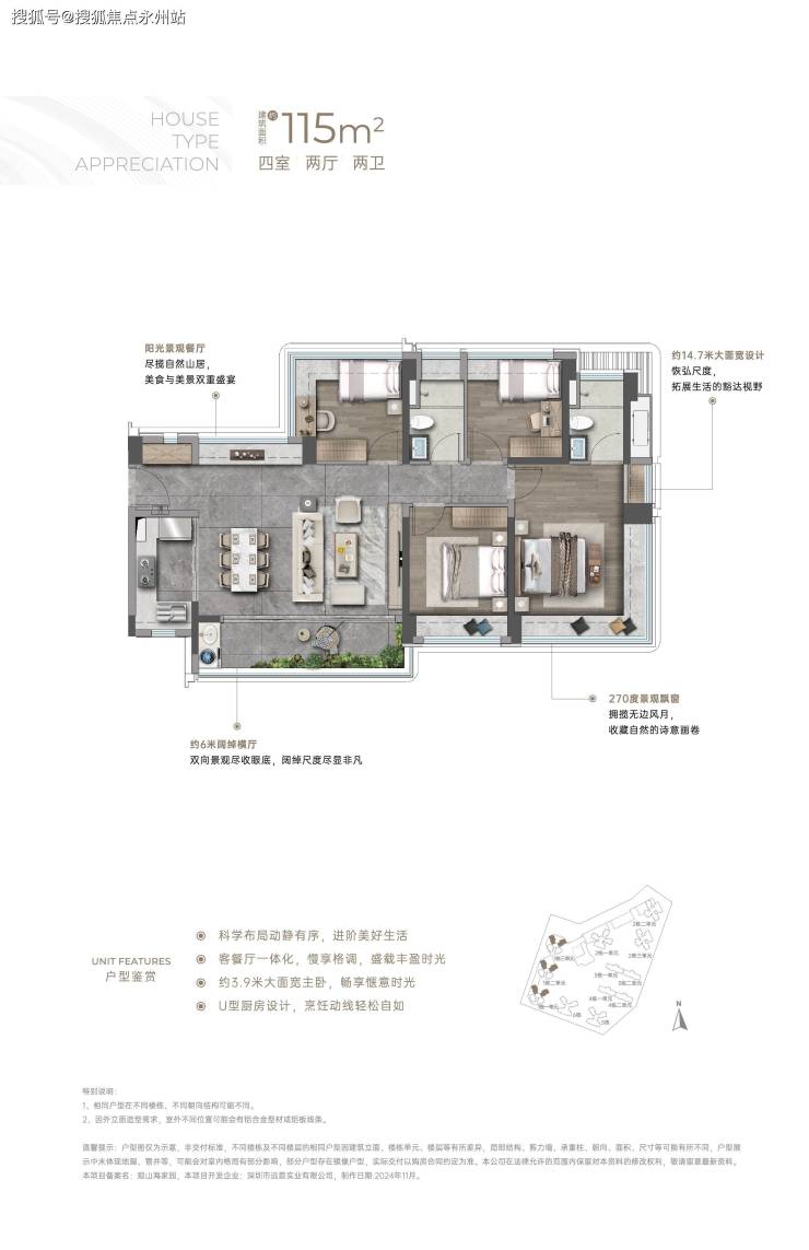 建面约115㎡4房2卫:东南或西南朝向以及西北朝向,有3种户型格局,但整体差异并不大,都是横厅设计,阳台也都非常宽敞。主要核心区别是阳台的设计,这应该是为了贴合楼栋朝向、景观所做的调整。