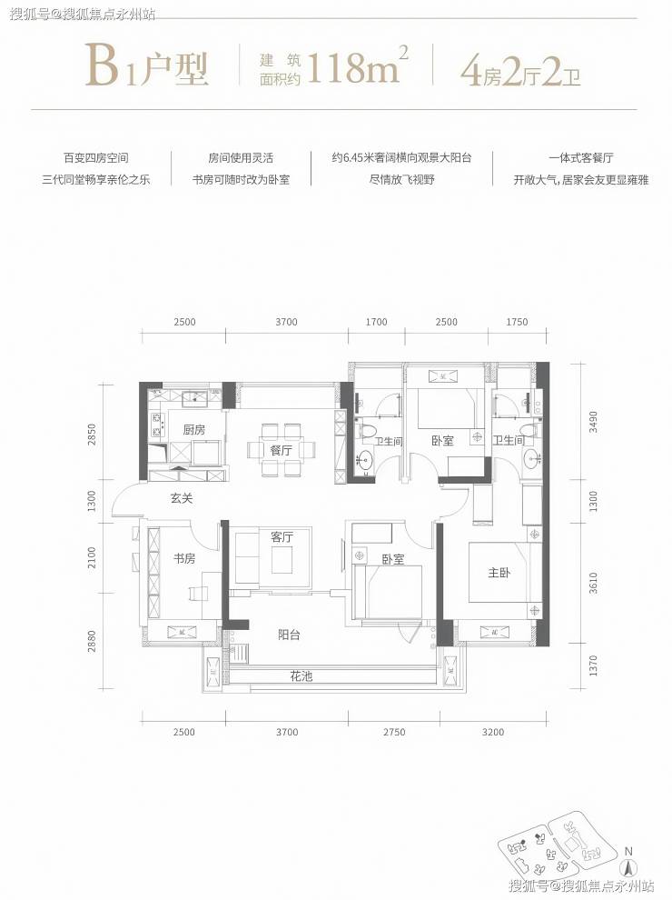 118㎡的4房2厅2卫,设计的是竖厅南北通透格局,客厅3.7米开间,进门玄关,四开间朝南,4个卧室分别做到了主卧15.71㎡/次卧9.02㎡/次卧8.72㎡/次卧8.27㎡(包含墙体飘窗),客厅连接次卧出6.45米长的大阳台,U型厨房,卫生间干湿分离,得房率73.44%(不含赠送),阳台主朝东南或西南向。