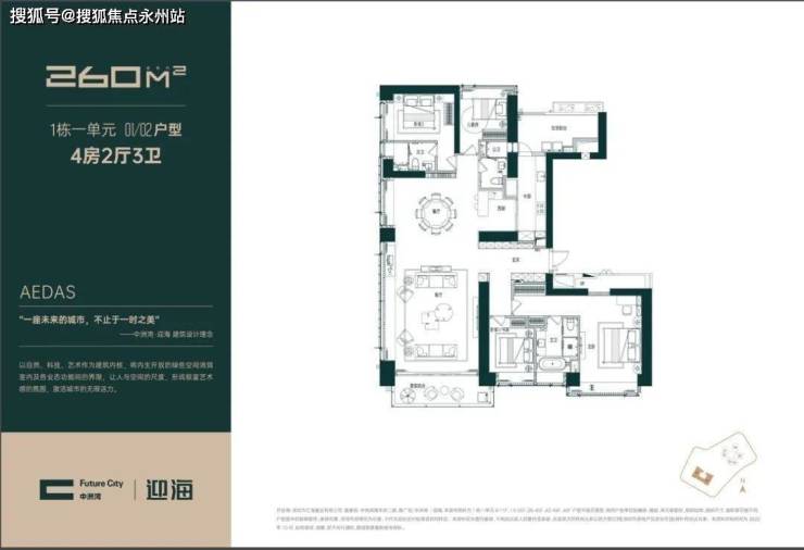 一线品牌精装交付、126/260㎡3-4房主力户型,板楼设计,2梯2户/5梯6户舒适梯户比