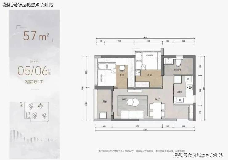 57平2房2厅户型:客厅开间2.75m ,而且还做了一个独立的玄关位,,非常适合小两口刚需上车自住使用,也是卖的最快的一个户型。