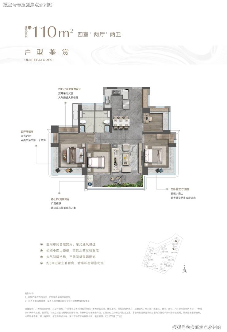 竖厅户型(如110㎡):双龙抱珠格局,独立入户,阳台长6.1米,U型厨房,西南向看山景,得房率约96.5%,折后总价717-1009万/套。