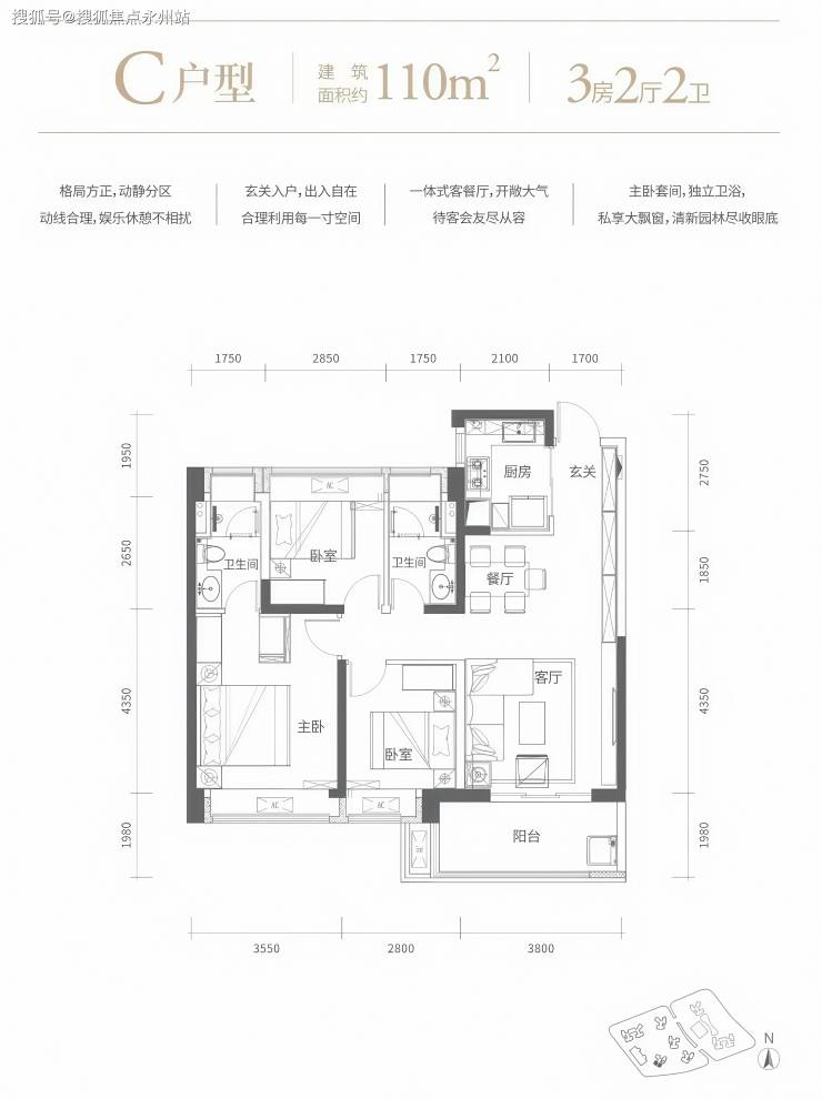 110㎡的3房2厅2卫,A2户型,设计的是经典竖厅格局,客厅3.8米开间,进门玄关,LDKB一体化设计,动静分区,三开间朝南,3个卧室分别做到了主卧17.57㎡/次卧9.26㎡/次卧8.96㎡(包含墙体飘窗),L型厨房,卫生间干湿分离,得房率73.97%(不含赠送),西南朝向。