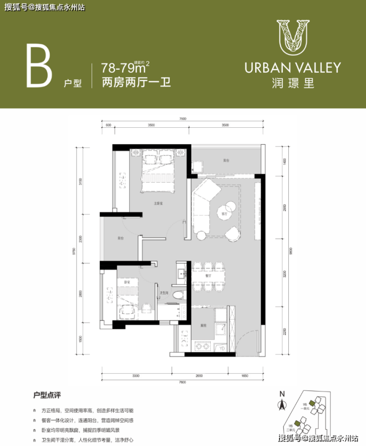 79平米户型有两个朝向,西北朝向和东南朝向,仅仅是朝向不同,户型设计方面完全一样。阳台西北方向的户型两个次卧均是西南朝向,很好弥补了采光问题;阳台东南朝向的户型,房间有西南朝向和东北朝向。