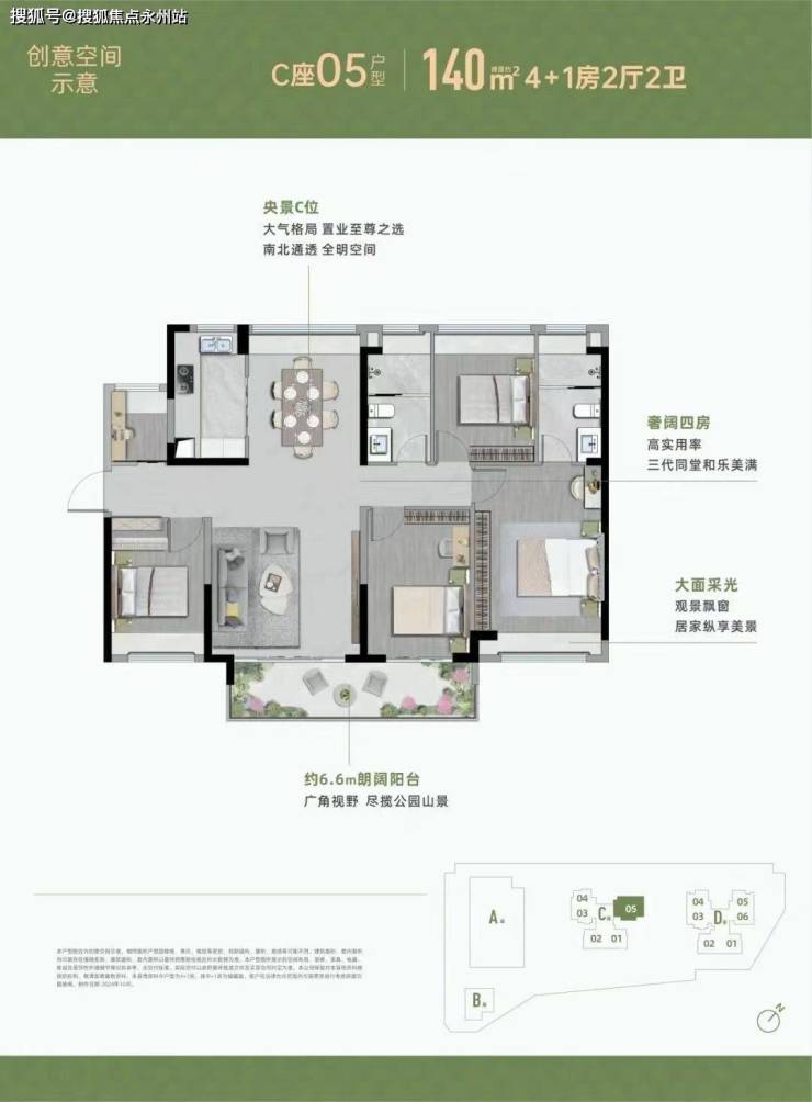【140㎡4+1房2厅2卫】 央景C位,南北通透 全明空间 大面采光,居家纵享美景 约6.6m朗阔阳台,广角视野尽揽公园山景 奢阔四房,高实用率三代同堂和乐美满