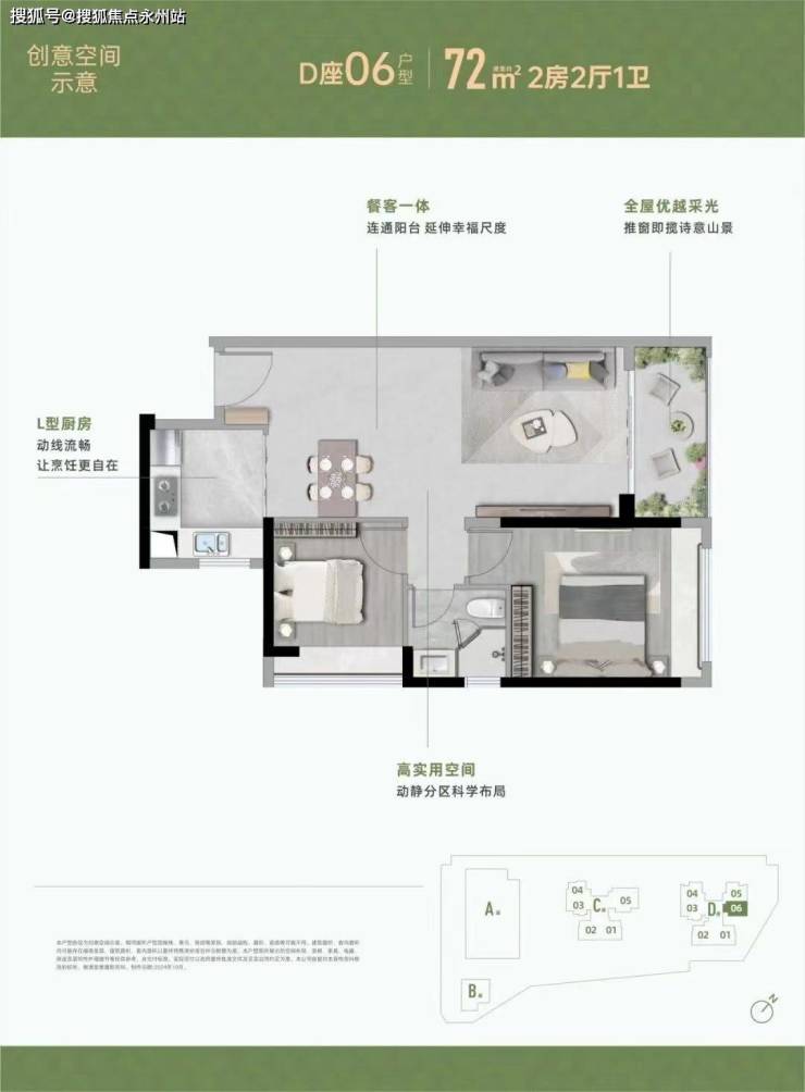 【72㎡2房2厅1卫】 高实用空间,动静分区科学布局 全屋优越采光,推窗即揽诗意山景 餐客一体,连通阳台 延伸幸福尺度 L型厨房,动线流畅让烹饪更自在