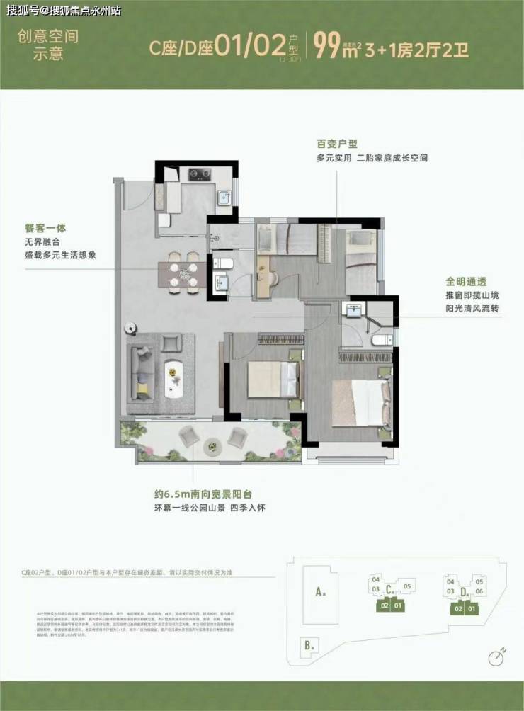 【99㎡3+1房2厅2卫】 约6.5m南向宽景阳台,环幕视野 四季入怀 餐客一体,无界融合 盛载多元生活想象 全明通透,推窗即揽山境阳光清风流转 百变户型,多元实用 二胎家庭成长空间