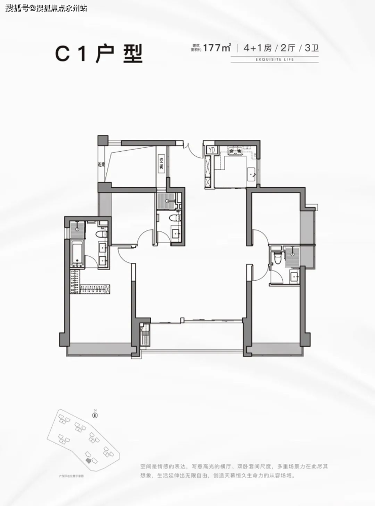 177㎡的4房2厅3卫,楼王单位,3梯3户,设计的是竖厅双龙抱珠格局,超大方形客厅,设计有2个独立套房,U型厨房,得房率:77.43%(不含赠送),西南朝向。