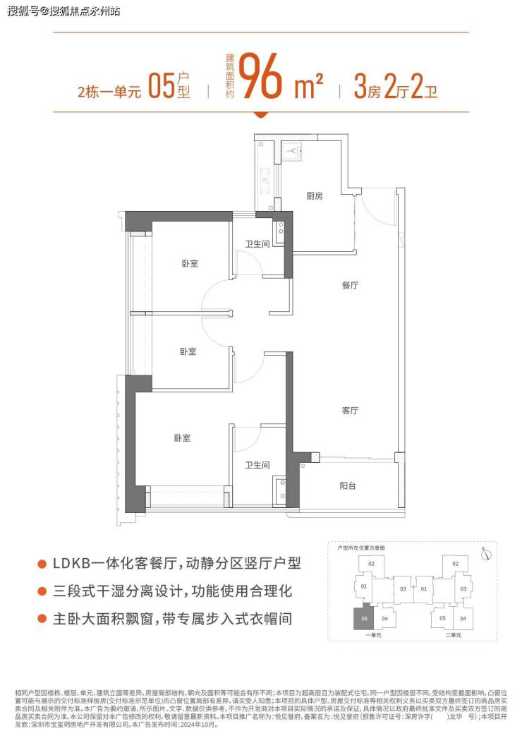 96㎡的3房2厅2卫,设计的是竖厅格局,客厅3.35米开间,LDKB一体化设计,动静分区,三开间朝南,U型厨房,公卫三段式分离,得房率:72.29%(不含赠送),西南朝向。