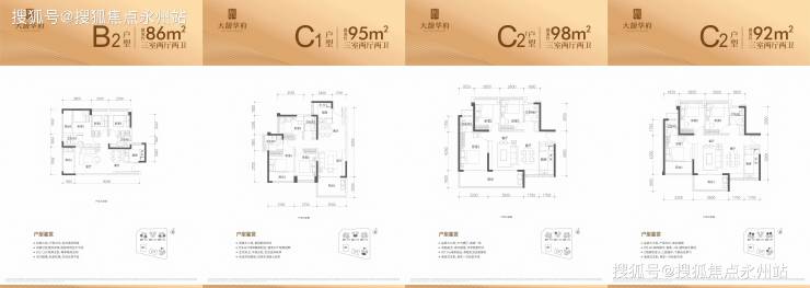 86-98㎡3房2卫:折后总价365-418万/套,折后单价4.14-4.72万/㎡,88-96%得房率,横厅设计,南北通透,主卧套房。