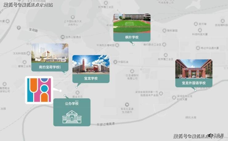 项目自带1所12班制的幼儿园,家门口规划有1所九年一贯制公办学校,根据龙岗区教育局2023年学区划分,小初学区划分在宝龙学校(300米)、宝荷学校(500米)、宝龙外国语学校(距离约4公里,有校车可以接送)。