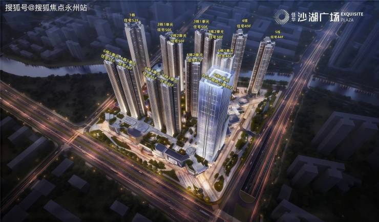 佳华沙湖广场,由佳华集团操盘,总占地面积约8.17万㎡,总建筑面积约62.2万㎡,计容建筑面积约42.6万㎡,容积率5.21,绿化率30%,共由6栋14个单元总高44-52F的住宅组成,其中1栋回迁房52F,2栋1/2单元回迁房50F,3栋1/2单元商品房50F,4栋商品房49F,5栋商品房44F,6栋1/3单元商品房46F,6栋2单元商品房47F,6栋4/5/6单元回迁房46F,6栋7单元办公+商务公寓45F,7栋规划1所幼儿园。