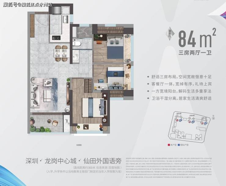 84㎡的3房2厅1卫:设计的是竖厅格局,客餐厅一体化,L型厨房,卫生间三段式分离,得房率:70.9%(不含赠送),阳台朝西南或东南向。