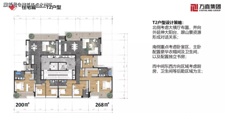项目将分两期开发,一期推售1栋的共180户,二期共340户,户型方面,有120㎡三房两卫两种户型、200㎡三房三卫、268㎡四房四卫和5套400㎡5房5卫顶层复式。一期推售的1栋全是120㎡的三房两卫,两梯三户。