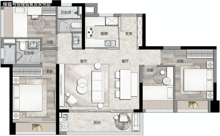约170㎡户型,结构上实现了3个带独立卫生间的完整居住空间,就算是三代同堂,也能互不干扰。