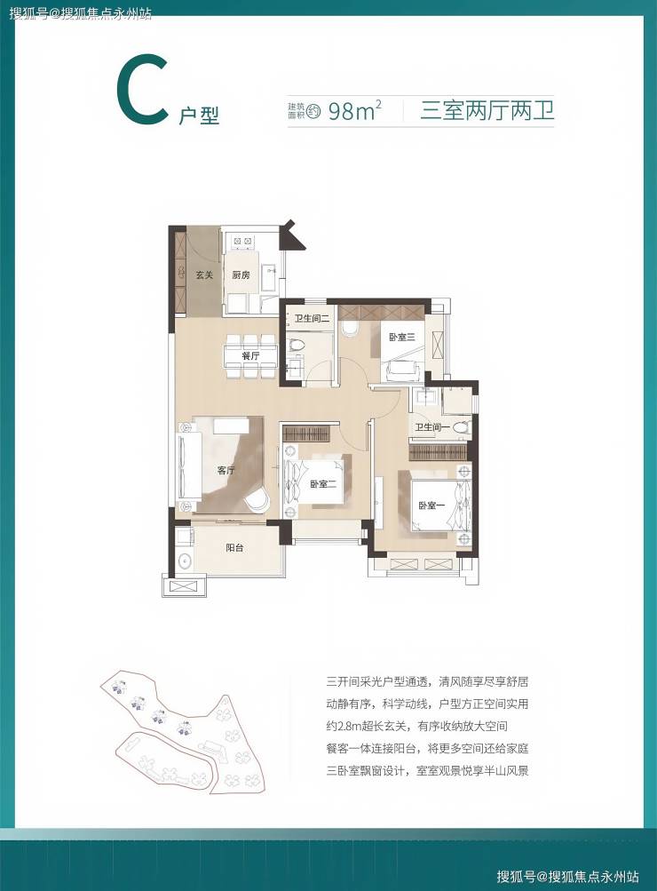98㎡的3房2厅2卫,设计的是经典竖厅格局,餐客厅一体化设计,三开间朝南,U型厨房,得房率:79.25%(不含赠送),阳台朝西南或东南向。