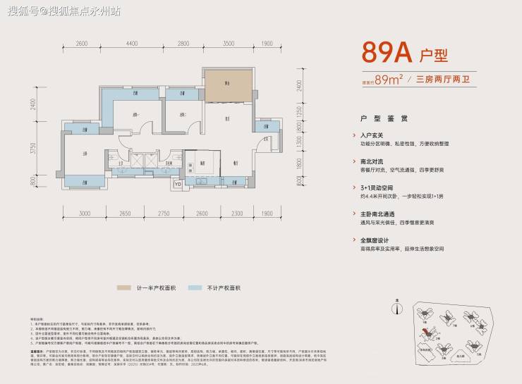 89㎡的3房2卫,西南/东南,折后总价297-331万,折后单价3.35-3.73万/㎡。