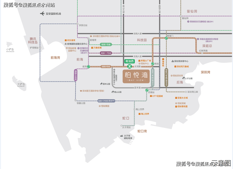 轨道交通:地铁9号线南油西站上盖,1/2/5/11/12号线南山站,13/15号线(建设中)四海站环伺。