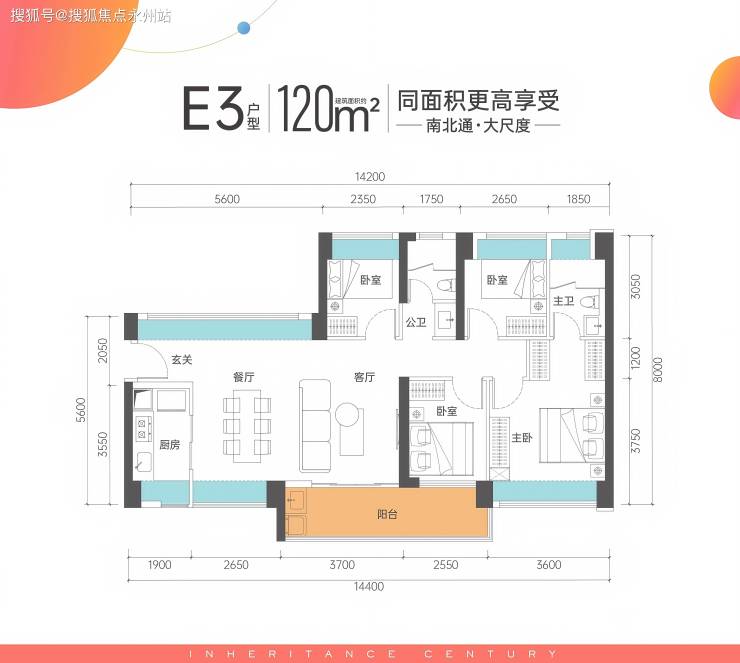 E1 户型:竖厅设计,客厅 4.2 米开间,6.6 米长阳台连通客厅与次卧,可打造空中花园或健身区。