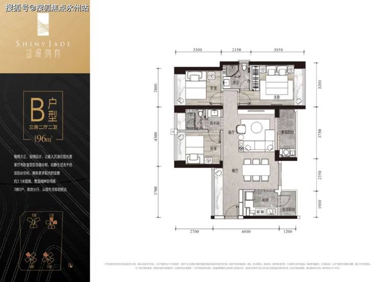 B户型96㎡3房2厅2卫:东/西南/东南朝向,稀缺6.1米大横厅,入户3.7米超长飘窗,拥有大户型空间感。