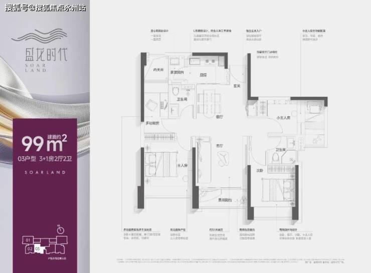03户型99㎡3+1房2厅2卫:设计的是竖厅双龙抱珠格局,客厅3.5米开间,进门入户玄关,LDKB一体化,三开间朝南,有1个多功能房间可以改多1个卧室,L型厨房带1个生活阳台,卫生间干湿分离,阳台西南朝向。