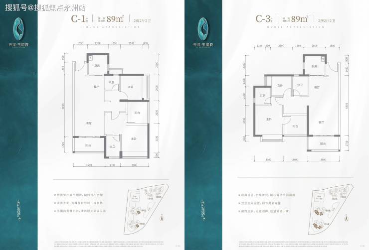 89㎡三房两厅两卫:竖厅或经典竖厅设计,客厅开间3.5-3.6米,部分户型可享茅洲河景观,房间宽度3.1-3.3米,公卫采用三段式分离,得房率90.6%-92.1%(含赠送)。例如C3户型动静分离,U型厨房,阳台进深1.7米。