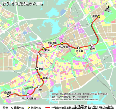 该线路总共规划12座车站,包括南塘围,坪山人民医院,汤坑,锦龙,新围,宝山,新和,坪山剧院,坪山中心,燕子岭,南布,聚龙站,时速80公里。