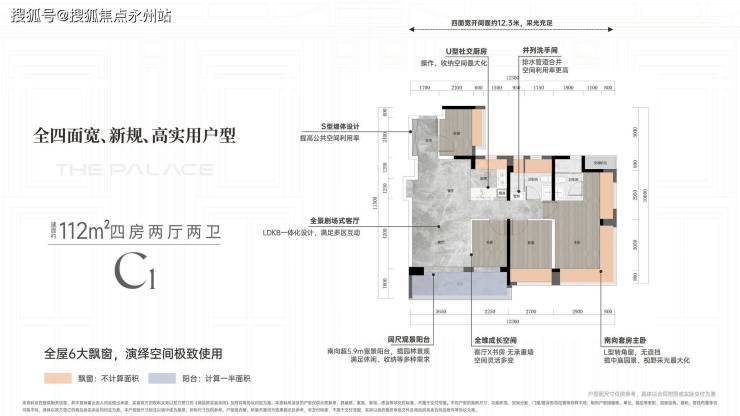建面约112㎡四房两厅两卫(C1户型):经典竖厅设计,四开间朝南,LDKB 一体化布局,S墙预留冰箱位。主卧270°转角无柱凸窗,次卧可灵活改造为书房或儿童房。超大景观阳台(约6米开间)将晾衣区与观景区分开,保证私密性。