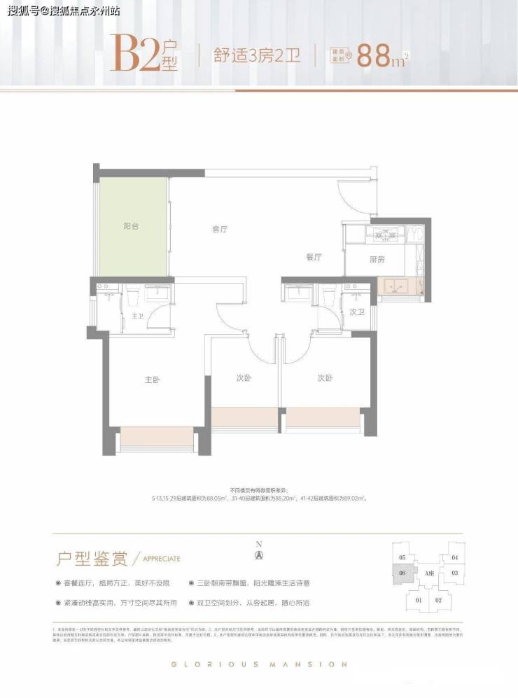 88㎡的3房2厅2卫:仅1栋A座06户型才有,设计的是竖厅格局,客厅3.35米开间,LDKB一体化,动静分区,3个卧室分别做到了3.2米/2.95米/2.25米的宽度,卧室全南向,U型厨房,公卫三段式分离,阳台正东朝向。