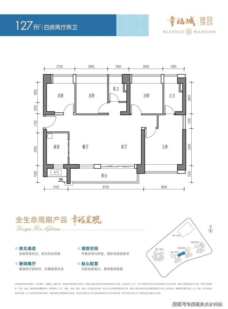 建面127㎡四房两厅两卫(横厅):亮点的6.7米宽阳台,客厅与阳台联动,营造开阔视野,双卫配置、主卧套间、书房布局,让家庭成员各自拥有专属空间,贴近自然,适合改善型家庭。