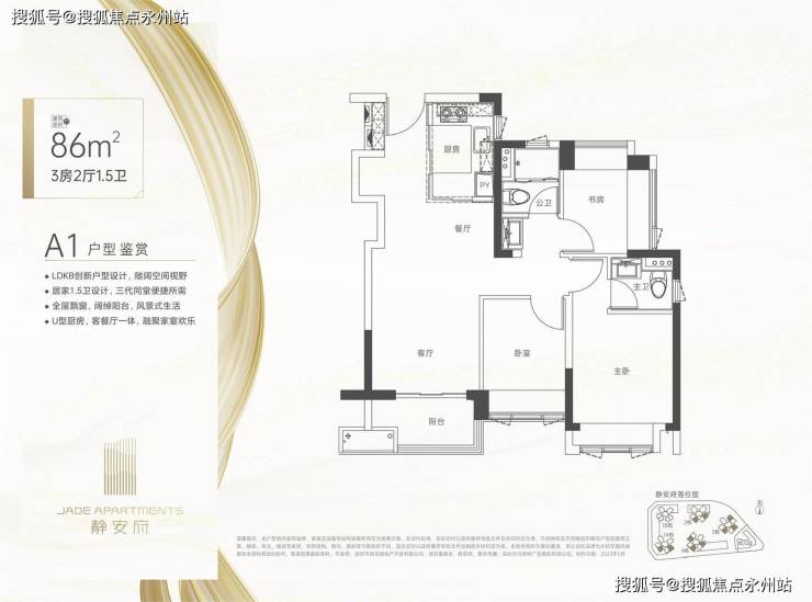 约86㎡3房1.5卫(1栋A座04/06户型、2栋03/05户型、3/4栋03/05/07户型)竖厅格局,餐客一体,动静分区结构,S型墙体预留冰箱位,创新型1.5卫设计,卫生间干湿分离设计,有东南、东北、西南朝向。