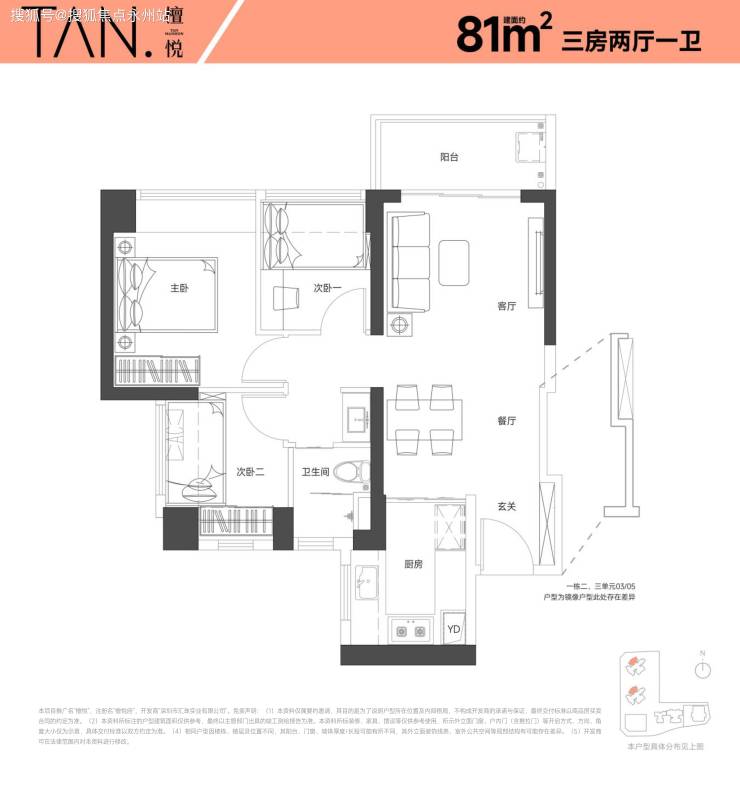 建面约81㎡三房两厅一卫(西北朝向)竖厅格局:采用 LKDB 一体化设计(客厅、餐厅、厨房、阳台贯通),动线流畅,视觉空间延伸感强。