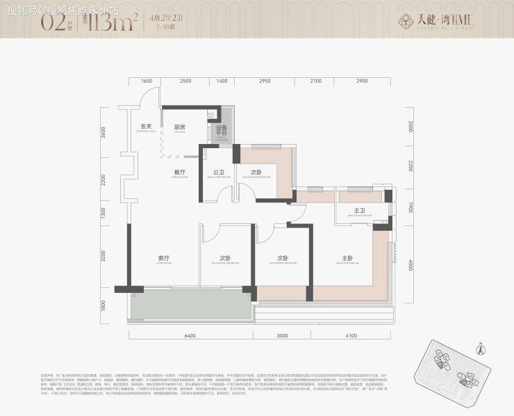 113㎡四房户型分析:该户型为项目主力产品,采用竖厅设计,南北通透,客餐厅与双阳台形成对流,通风采光极佳。户型亮点包括:6.4米长阳台(进深1.8米),主卧270°环绕式飘窗设计,全景海景套房配置,次卧与公卫采用类套房设计,适合多孩家庭。通过设备平台、飘窗等赠送面积,实际使用面积接近120㎡,得房率超高。