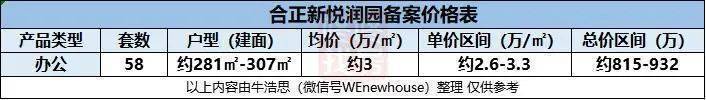 办公楼产品58套,建面约281-307㎡,均价约3万/㎡,单价区间约2.6-3.3万/㎡,总价区间约815-932万/套。