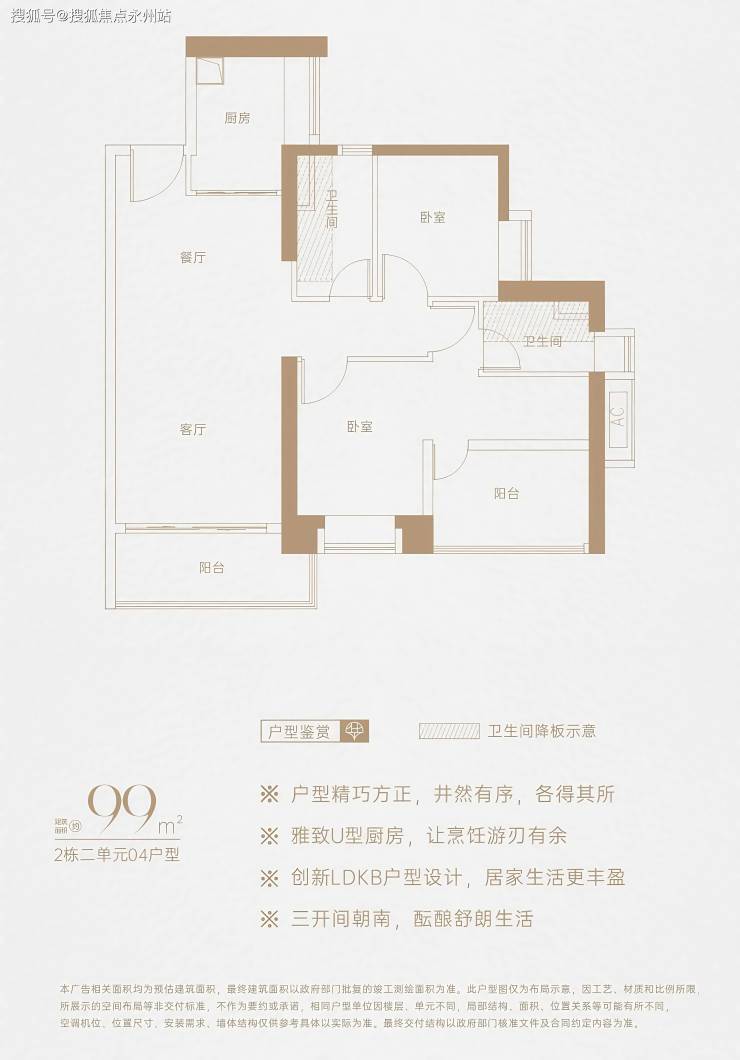 99㎡3房2厅2卫:动静分区,三开间朝南,L型厨房,西南朝向阳台,得房率约73%(不含赠送)