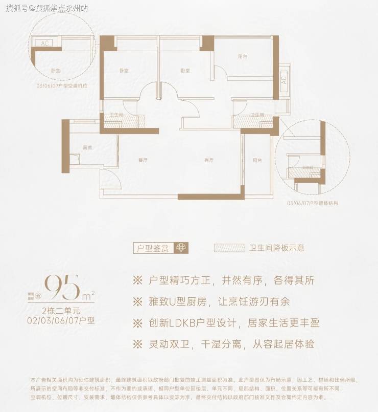 95㎡3房2厅2卫:竖厅格局,创新LDKB一体化设计,L型厨房,干湿分离卫生间,东南或西北朝向阳台,得房率约73%(不含赠送)。
