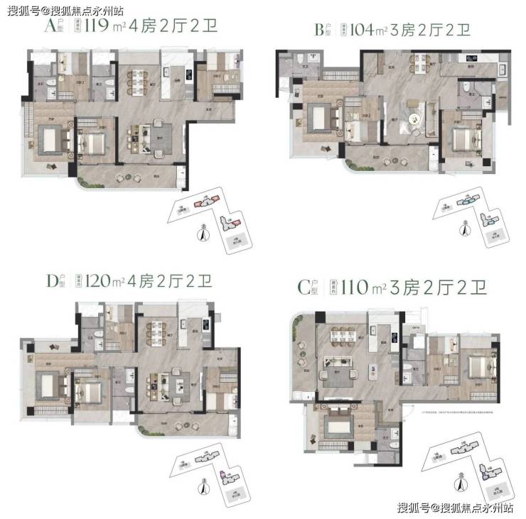 119-120㎡的4房2厅2卫:119㎡分布于2/3栋共3条腿,120㎡只有一条腿朝西位于3栋,南北通透设计。