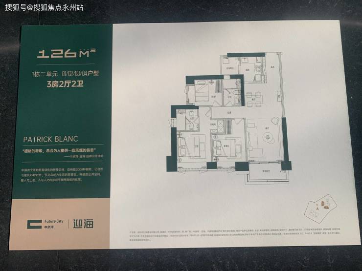 1栋2单元为61F高的为5梯6户设计,每层3.05米层高,有两种户型分别为01-04的126㎡传统三房二卫和126㎡的3+1房二卫横厅户型。
