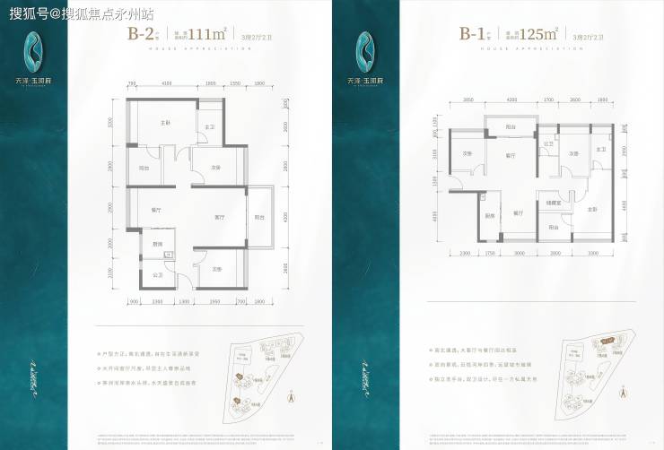 B2户型(111㎡):竖厅南北通透,客厅开间4.2米,全屋飘窗,东北向花园视野,得房率94.6%(全盘最高)