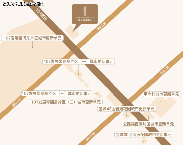 河东社区首发项目——河东骏濠国际,位于河东社区北区,总建面约16万㎡,汇聚商务公寓、办公、商业等于一体,多重复合业态共融,打造107国道封面都会综合体。