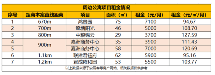 目前距离本项目约700m的45㎡产品的月租金可达5000元,同时周边73㎡产品的月租金可达7000元。