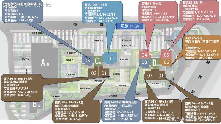 99㎡三+1房两厅两卫(东南朝向):三开间朝南,约6.5米南向宽景阳台,主卧套房设计(14.12㎡+独立卫浴),其中一次卧可改造为书房或儿童房。