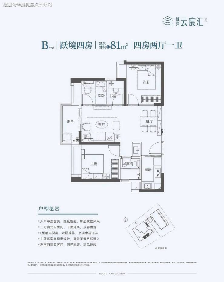 81㎡ 四房两厅一卫:双龙抱珠格局,三开间朝南,L型厨房,四开间朝南设计。朝向:东南向阳台,主卧带飘窗。