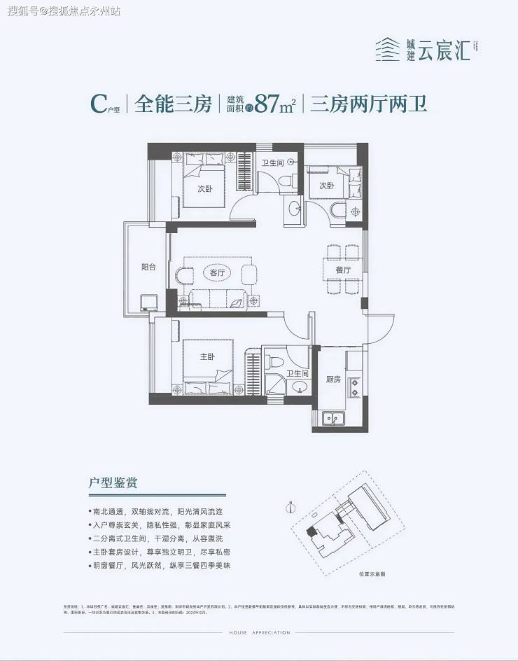 87㎡ 三房两厅两卫:双龙抱珠格局,三开间朝南,L型厨房,公卫三段式分离。朝向:西南向阳台,客厅面宽3.1米。