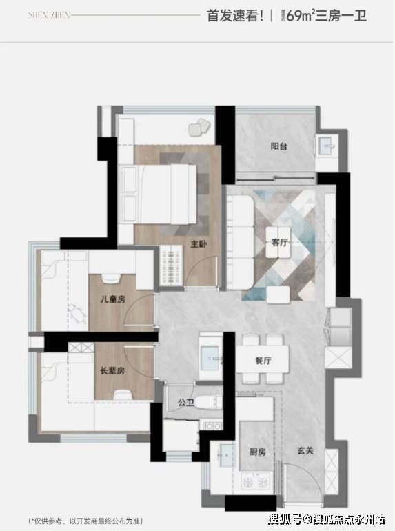 约69-70㎡ 3房1卫:刚需极致上车户型,也是项目最受关注的户型。入户预留玄关柜位置,U型厨房紧邻餐厅,上菜动线便捷,客厅连接阳台,采光充足;三个卧室尺寸适中,最小卧室可作为书房或儿童房,完全满足小家庭日常居住需求。